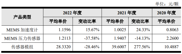 從市場的角度來看,以上產(chǎn)品中,MEMS加速度計單價呈上升趨勢,MEMS壓力傳感器和傳感器模組呈下降趨勢。該公司對單價上升的解釋為:主要系品牌客戶占比提高、產(chǎn)能緊缺背景下單價的上調(diào)所致。