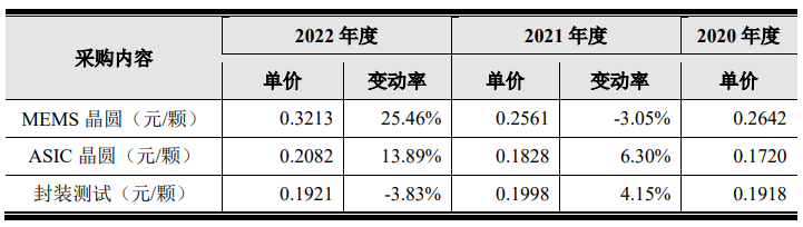 目前,明皜傳感的采購內(nèi)容主要有MEMS晶圓、ASIC晶圓、封裝測試。通過其招股書可以發(fā)現(xiàn),晶圓類材料價格在去年漲價幅度較大。其解釋為: