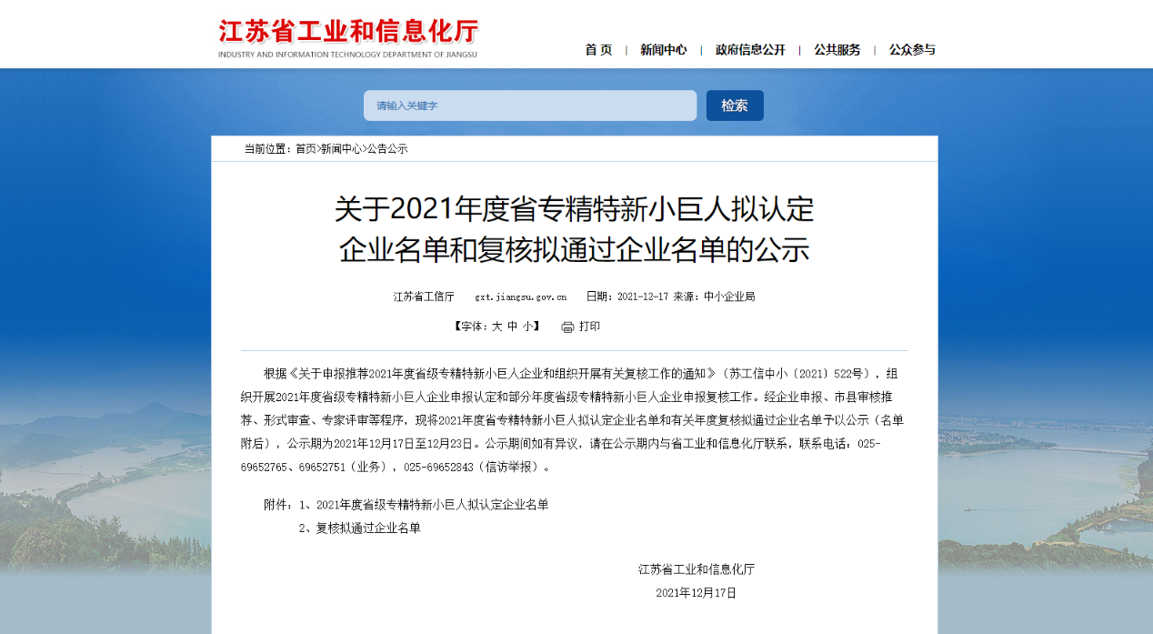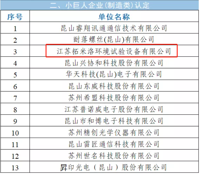 近日,江蘇省工信廳公布2021年度省專精特新小巨人擬認定企業(yè)名單和復核擬通過企業(yè)名單,江蘇拓米洛環(huán)境試驗設備有限公司獲得了小巨人企業(yè)(制造業(yè))的認定。
