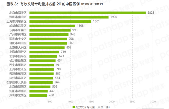 在“專精特新”小巨人企業(yè)專利能力的區(qū)域分布上,如果將顆粒度進(jìn)一步細(xì)分到區(qū),可以看到有效發(fā)明專利量排名前20的分別是,北京市海淀區(qū)、深圳市南山區(qū)、上海市浦東新區(qū)、成都市武侯區(qū)、廣東省東莞市、廣州市黃埔區(qū)、深圳市寶安區(qū)、合肥市蜀山區(qū)、北京市大興區(qū)和上海市閔行區(qū);11-20名的區(qū)域則有北京市昌平區(qū)、長沙市岳麓區(qū)、西安市雁塔區(qū)、上海市松江區(qū)、天津市東麗區(qū)、杭州市濱江區(qū)、石家莊市元氏縣和北京市朝陽區(qū)。