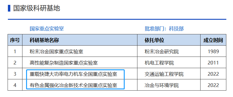 中南大學(xué)官網(wǎng)信息顯示,中南大學(xué)擁有“重載快捷大功率電力機(jī)車全國重點(diǎn)實(shí)驗(yàn)室”和“有色金屬強(qiáng)化冶金新技術(shù)全國重點(diǎn)實(shí)驗(yàn)室”;此外,3月15日,中南大學(xué)極端服役性能精準(zhǔn)制造全國重點(diǎn)實(shí)驗(yàn)室發(fā)布《極端服役性能精準(zhǔn)制造全國重點(diǎn)實(shí)驗(yàn)室2023年自主研究課題申請指南》,表明中南大學(xué)還擁有“極端服役性能精準(zhǔn)制造全國重點(diǎn)實(shí)驗(yàn)室”。