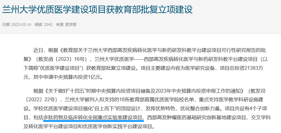 近日,蘭州大學(xué)優(yōu)質(zhì)醫(yī)學(xué)建設(shè)項(xiàng)目獲教育部批復(fù)立項(xiàng)建設(shè),項(xiàng)目共設(shè)有4個子項(xiàng)目,包括多肽藥物及臨床轉(zhuǎn)化全國重點(diǎn)實(shí)驗(yàn)室建設(shè)項(xiàng)目、西部高發(fā)腫瘤醫(yī)藥基礎(chǔ)研究創(chuàng)新基地建設(shè)項(xiàng)目、交叉學(xué)科及轉(zhuǎn)化醫(yī)學(xué)平臺建設(shè)項(xiàng)目和優(yōu)質(zhì)醫(yī)學(xué)創(chuàng)新實(shí)踐平臺建設(shè)項(xiàng)目。