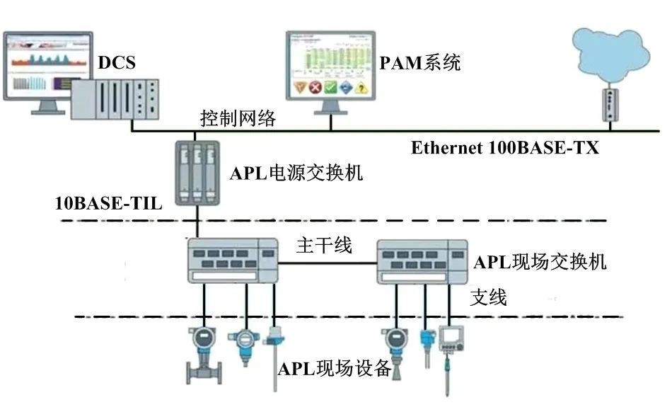 典型的Ethernet-APL控制系統如圖1所示。一般而言,除上層的DCS外,Ethernet-APL控制系統由APL電源交換機、APL現場交換機和APL現場設備構成[2]。