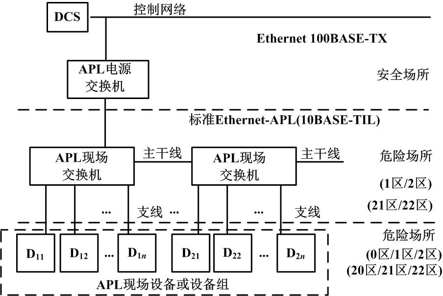 主干線連接的主要設備是APL現場交換機。它是實現Ethernet-APL控制系統防爆的關鍵設備。根據工業控制系統的應用規模,在每根最大允許長度為1 000 m的主干線上可連接若干臺APL現場交換機。這些設備一般都需要部署在爆炸性氣體或爆炸性粉塵危險場所,即爆炸性氣體環境中的1區或2區、爆炸性粉塵環境中的21區或22區。