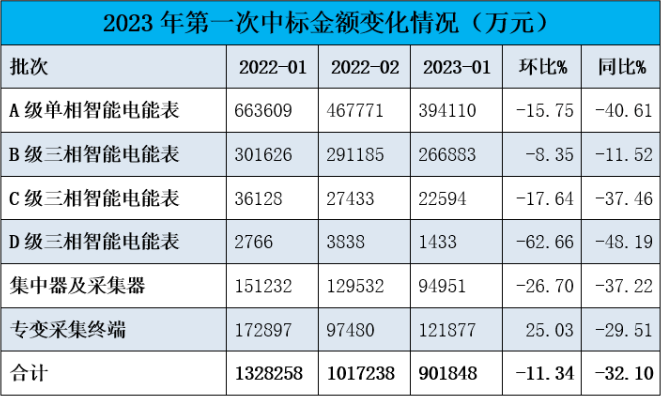 從中標金額的同比和環(huán)比數(shù)據(jù)來看,僅專變采集終端(含能源控制器專變)分標招標金額環(huán)比實現(xiàn)增長,D級三相智能電能表分標、A級三相智能電能表分標、C級三相智能電能表和集中器采集器分標同比降幅明顯。