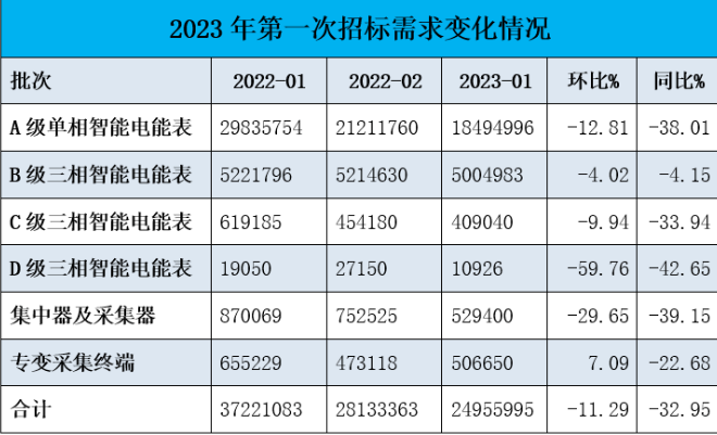 從需求量的同比和環(huán)比數(shù)據(jù)來看,除專變采集終端(含能源控制器專變)分標環(huán)比需求量有增長外,其他物資需求量都下降。