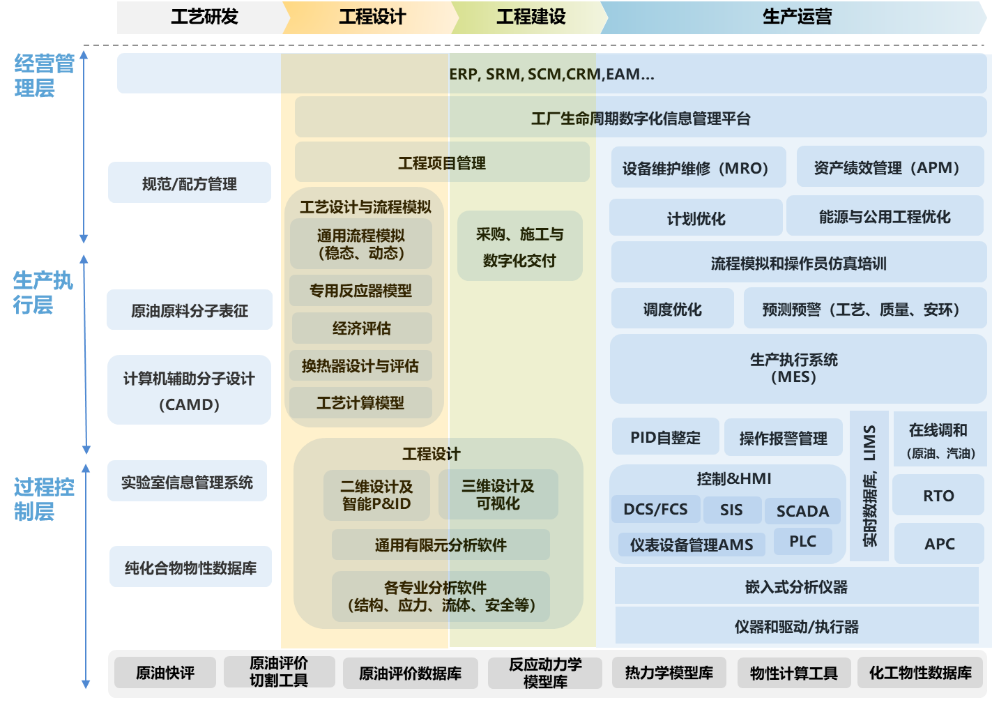 據估計,我國石化行業工業軟件市場規模約占國內工業軟件市場規模的10%,包括上百種軟件,可以從兩個維度來刻畫,如圖1所示。橫向是業務維度,包括工藝研發、工程設計、工程建設、生產運營等,覆蓋石油化工核心業務范圍;縱向是 ISA95 關于企業信息系統和控制系統的架構分層維度,從下往上包括過程控制層(PCS)、生產執行層(MES)以及經營管理層(ERP)等。