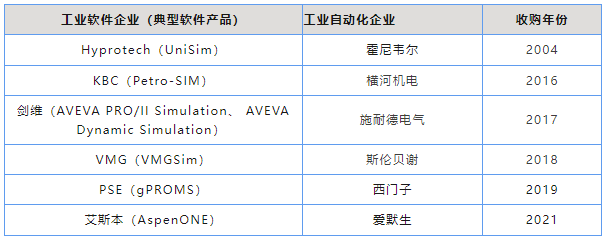 工業軟件的演進就是“大魚吃小魚”的過程。從20世紀90年代以來,收購和兼并成為國際 自動化企業擴張和數字化轉型的一個重要手段。進入21世紀以后,工業軟件的重要性日益凸顯,工業軟件成為自動化巨頭下半場爭奪戰的關鍵。西門子、施耐德電氣、愛默生、霍尼韋爾、海克斯康等工業硬件巨頭,紛紛加快并購優質工 業軟件企業,與自身的工業自動化、工業測量等拳頭產品形成軟硬一體的解決方案 。市場占有率靠前的商業流程模擬軟件全部被工業動化頭部企業收購,詳見表 1。