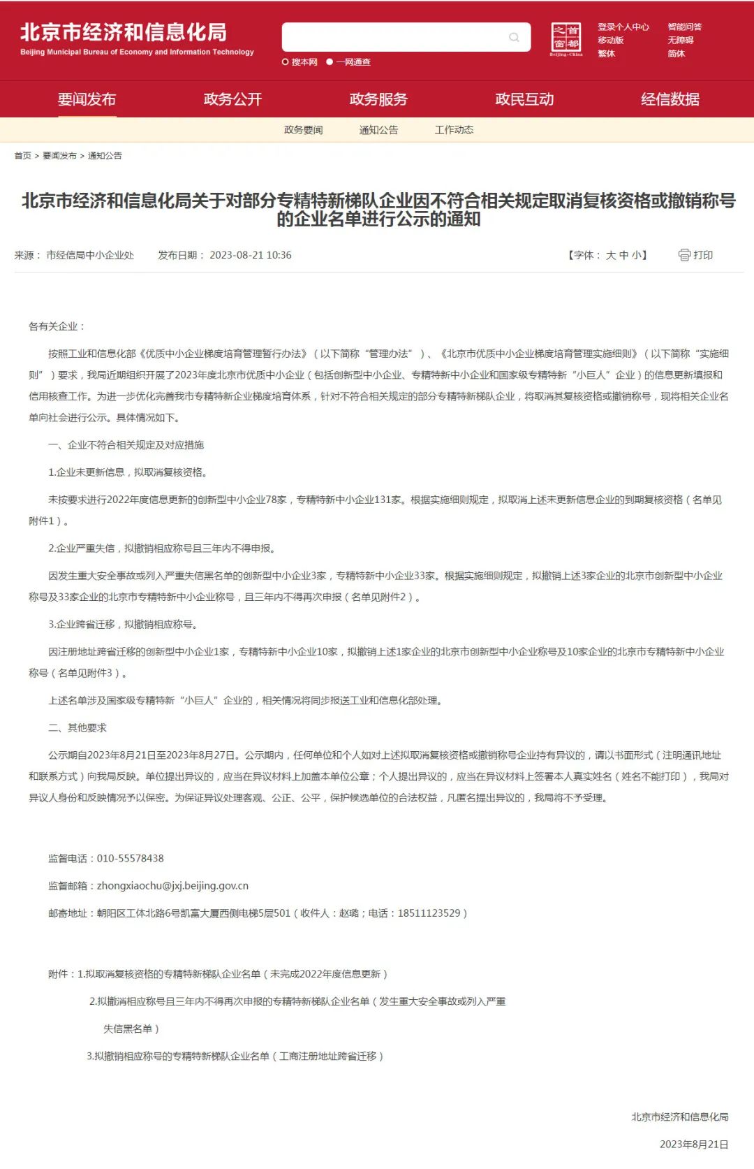 8月21日,北京市經(jīng)信局官網(wǎng)公布消息顯示,為進(jìn)一步優(yōu)化完善北京市專精特新企業(yè)梯度培育體系,針對(duì)不符合相關(guān)規(guī)定的部分專精特新梯隊(duì)企業(yè),將取消其復(fù)核資格或撤銷稱號(hào),并將相關(guān)企業(yè)名單向社會(huì)進(jìn)行公示。公示名單共涉及北京174家專精特新中小企業(yè)和82家創(chuàng)新型中小企業(yè)!