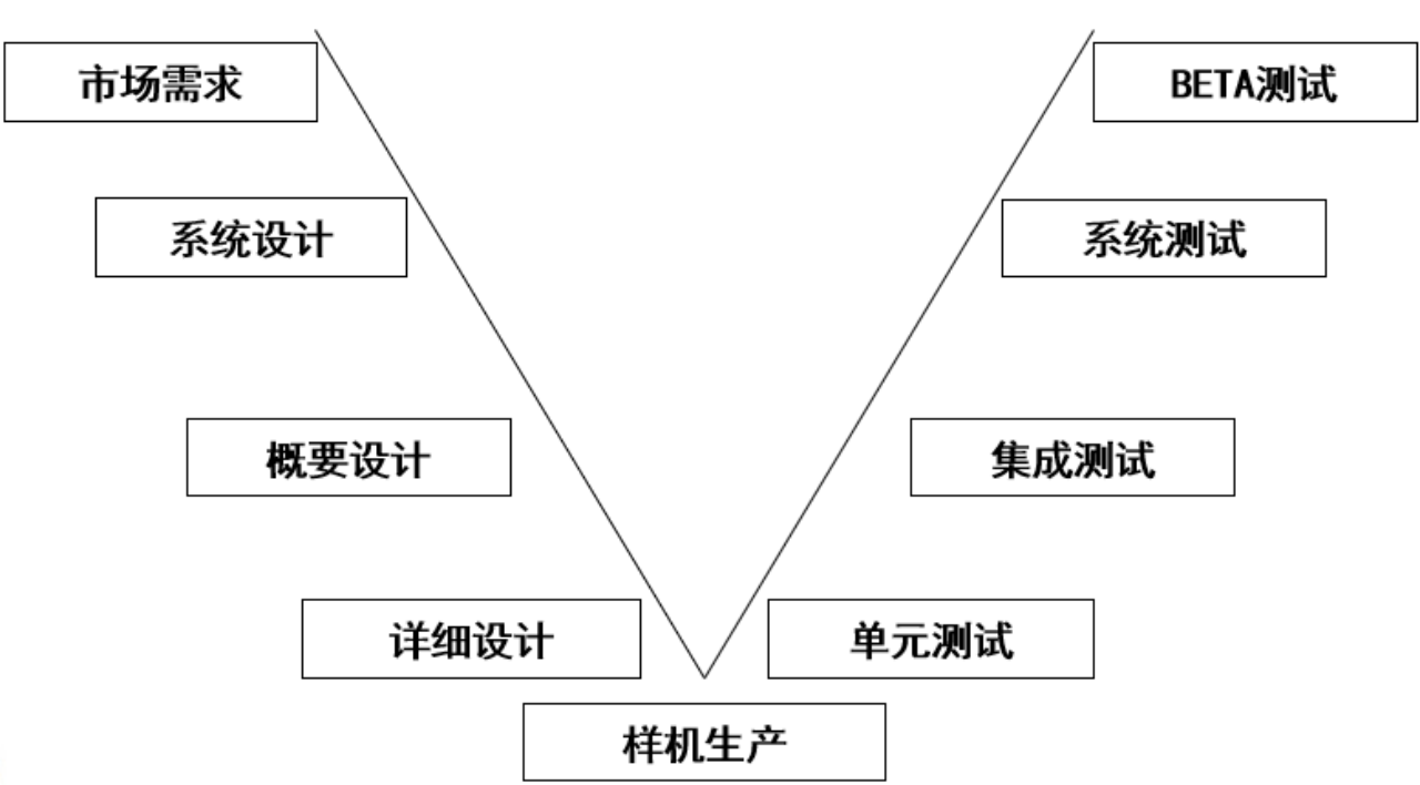 根據研發的具體活動提煉出了產品開發的“V”字模型。V字左側的每一個活動都有右側對應的測試手段來保證,每個測試的側重點不同,層層迭進。