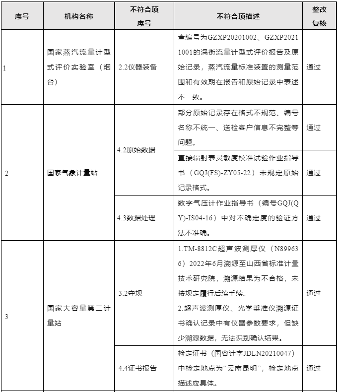 現(xiàn)場隨機(jī)抽查150份受檢機(jī)構(gòu)存檔證書(報告)及相應(yīng)原始記錄,發(fā)現(xiàn)存在人員培訓(xùn)不足、原始數(shù)據(jù)有誤等不符合項,未發(fā)現(xiàn)嚴(yán)重違法違規(guī)行為。