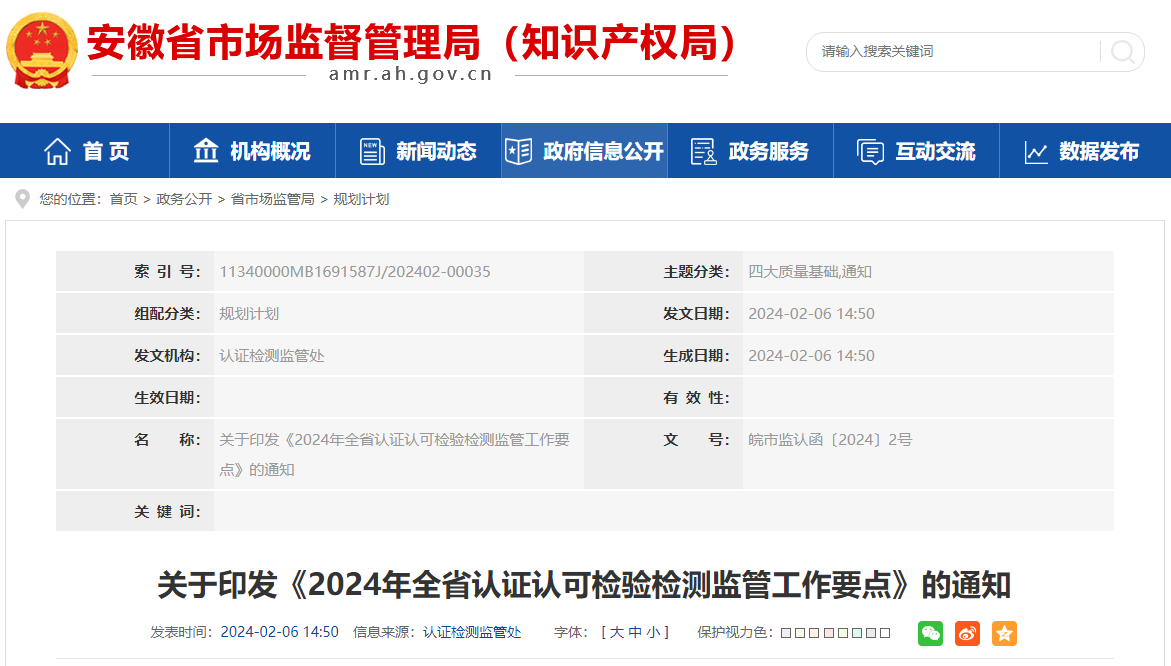 近日,安徽省市場監管局印發《2024年全省認證認可檢驗檢測監管工作要點》,提出鼓勵國內、國際知名認證機構在皖設立子公司或者辦事處。全文如下: