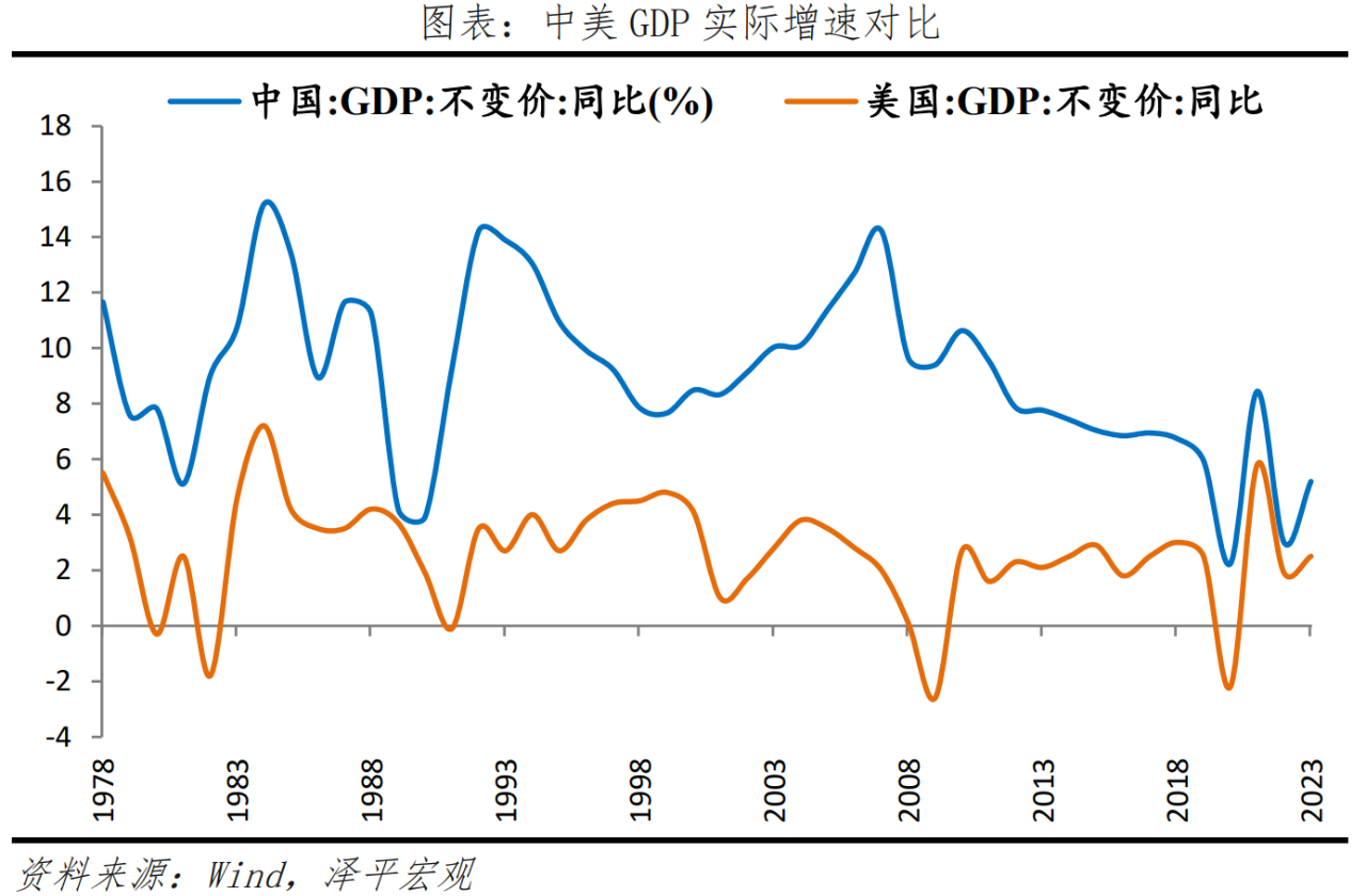 2023年中國GDP規(guī)模達(dá)126萬億元,相當(dāng)于17.9萬億美元,保持世界第二大經(jīng)濟(jì)體地位。美國2023年GDP為27.4萬億美元,中國GDP相當(dāng)于美國的約65.4%,受匯率影響,中美差距略有擴(kuò)大。2023年中國GDP實(shí)際增速5.2%,低于1978-2008年高速增長期的平均增速9.8%,高于美國的2.5%,越南、印度經(jīng)濟(jì)增速分別為5.1%和6.7%。