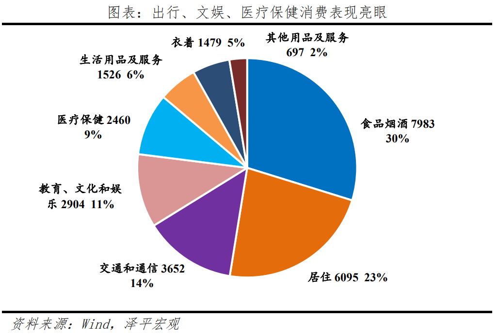 消費(fèi)以服務(wù)消費(fèi)反彈最快,人均服務(wù)性消費(fèi)支出增長14.4%,約占居民人均消費(fèi)支出的比重達(dá)到45.2%。出行、文娛、醫(yī)療和智能消費(fèi)成為消費(fèi)新活力。2023年人均消費(fèi)支出中,教育、文化和娛樂支出,交通和通信支出,醫(yī)療保健支出所占份額為10.8%、13.6%和9.2%,較2022年分別提高0.8、0.6和0.5個(gè)百分點(diǎn)。