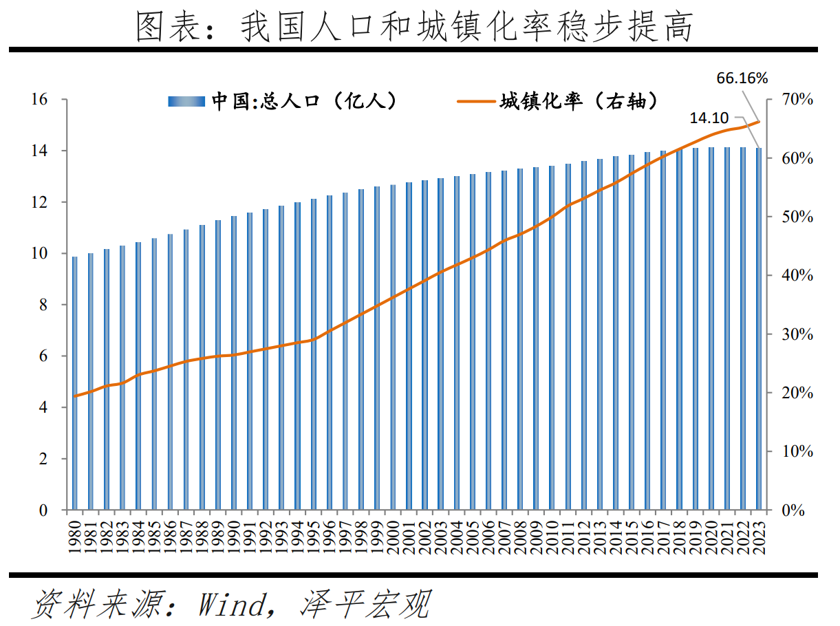 2023年末常住人口城鎮(zhèn)化率達(dá)66.16%,較上年末提高0.94個(gè)百分點(diǎn),標(biāo)志著當(dāng)前我國新型城鎮(zhèn)化進(jìn)程穩(wěn)步推進(jìn),但較高收入經(jīng)濟(jì)體的81.3%仍有15.1個(gè)百分點(diǎn)的空間。過去四十年,中國城鎮(zhèn)常住人口從1.7億快速增至9.3億,凈增加7.6億,城鎮(zhèn)化率從17.9%提升至66.2%,提高48.3個(gè)百分點(diǎn),深刻地改變了中國經(jīng)濟(jì)社會(huì)格局,成就了過去中國重化工業(yè)、大規(guī)模基礎(chǔ)設(shè)施投資、房地產(chǎn)、消費(fèi)升級(jí)等的飛速發(fā)展。當(dāng)前中國城鎮(zhèn)化率已高于55.3%的世界平均水平,達(dá)到中高收入經(jīng)濟(jì)體水平,但明顯低于高收入經(jīng)濟(jì)體的81.3%,中國城鎮(zhèn)化還有約15.1個(gè)百分點(diǎn)的空間。