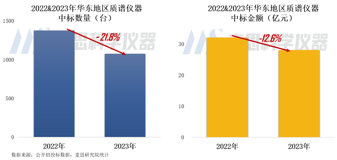 2023年華東地區質譜儀器中標數量約1100臺,同比減少21.8%。中標金額約28億元,同比減少12.6%,降幅小于全國平均值。中標數量和金額在全國市場的占比分別為36.5%41.5%