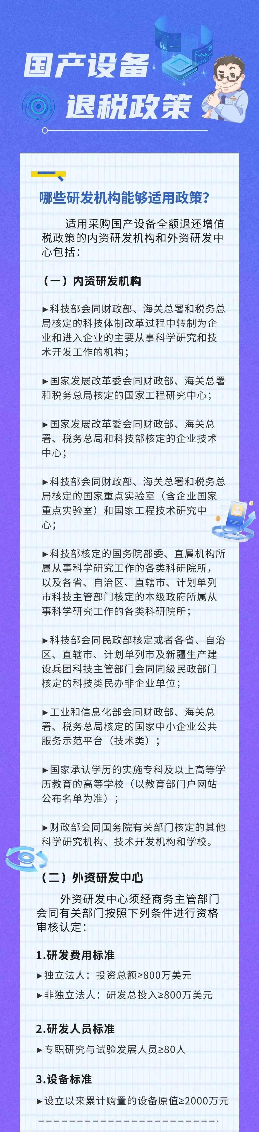 日前,財政部、商務(wù)部、稅務(wù)總局三部委聯(lián)合發(fā)文《關(guān)于研發(fā)機(jī)構(gòu)采購設(shè)備增值稅政策的公告》明確指出內(nèi)資研發(fā)機(jī)構(gòu)和外資研發(fā)中心采購國產(chǎn)設(shè)備全額退還增值稅。也就是說只要是研發(fā)中心,采購國產(chǎn)設(shè)備,一律退回增值稅!國家在用真金白銀補(bǔ)貼國產(chǎn)設(shè)備!其中,哪些研發(fā)機(jī)構(gòu)能夠適用政策?哪些國產(chǎn)設(shè)備能夠退還增值稅?享受退稅政策需要做哪些準(zhǔn)備?...今天,小編帶您看看具體內(nèi)容~↓↓↓