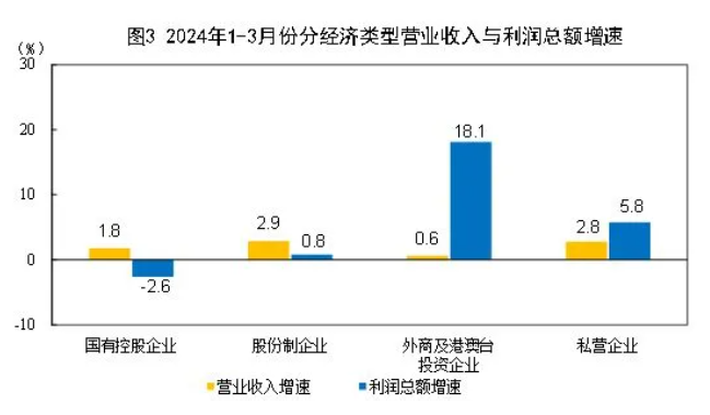 1-3月份,規模以上工業企業中,國有控股企業實現利潤總額5738.2億元,同比下降2.6%;股份制企業實現利潤總額11203.0億元,增長0.8%;外商及港澳臺投資企業實現利潤總額3737.5億元,增長18.1%;私營企業實現利潤總額3679.7億元,增長5.8%