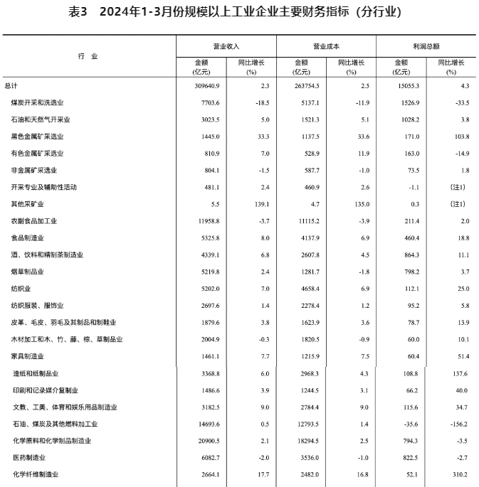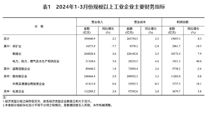 20241-3月份,全國規模以上工業企業實現利潤總額15055.3億元,同比增長4.3%(按可比口徑計算)。