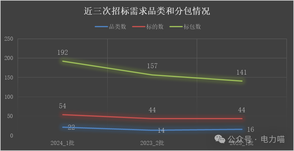 本次招標主要需求包含22個品類、54個標的、192個標包。本次招標新增的物資品類主要是中壓開關自動化成套柜小類增加安全可控品類產品。