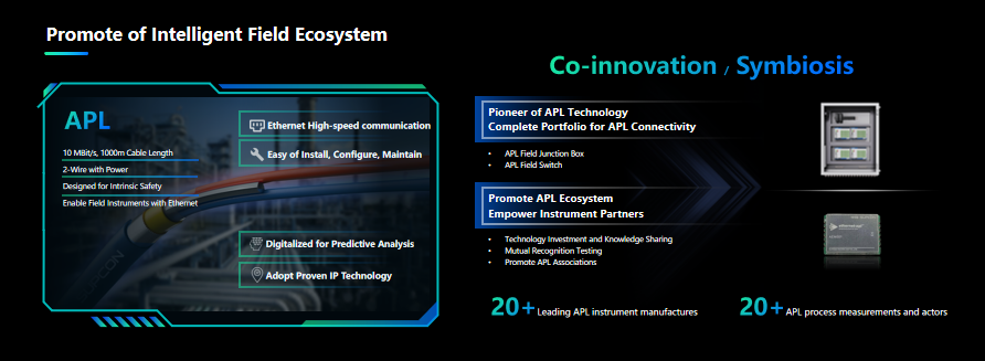 Nyx采用基于APL的現(xiàn)場(chǎng)連接技術(shù),支持2區(qū)本安防爆的現(xiàn)場(chǎng)連接箱和APL模組,實(shí)現(xiàn)儀表IP化,通信速率提升100倍以上,推動(dòng)全數(shù)字化現(xiàn)場(chǎng)傳感與執(zhí)行,實(shí)現(xiàn)智能化工廠數(shù)據(jù)互聯(lián)互通。中控技術(shù)始終秉持共創(chuàng)、共享、共生的理念,積極打造Ethernet-APL生態(tài),可提供包括電源交換機(jī)、現(xiàn)場(chǎng)交換機(jī)、智能儀表等全線APL產(chǎn)品。