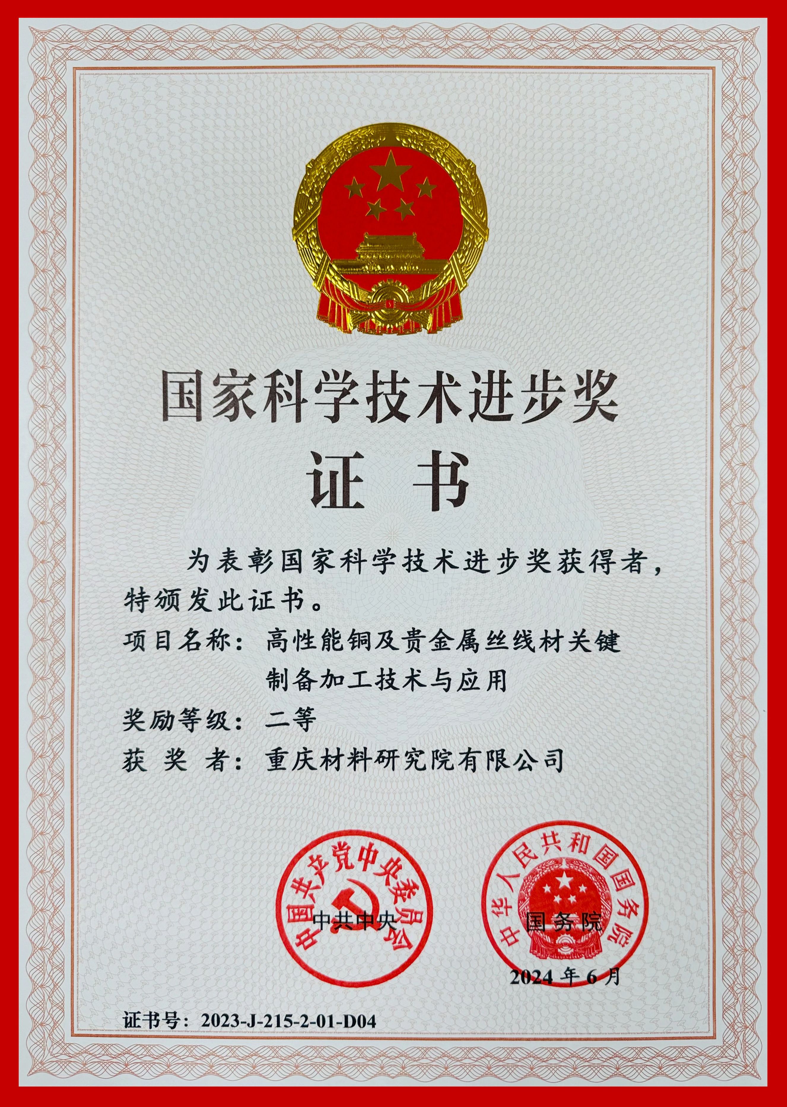 6月24日,全國科技大會、國家科學(xué)技術(shù)獎勵大會和中國科學(xué)院第二十一次院士大會、中國工程院第十七次院士大會在北京隆重召開,2023年度國家科學(xué)技術(shù)獎揭曉。重慶材料研究院有限公司作為主要參加單位完成的“高性能銅及貴金屬絲線材關(guān)鍵制備加工技術(shù)與應(yīng)用”項(xiàng)目榮獲2023年度國家科學(xué)技術(shù)進(jìn)步獎二等獎。重材院黨委委員、副總經(jīng)理(主持經(jīng)理層工作)吳保安作為獲獎?wù)邊⒓颖敬位顒印?