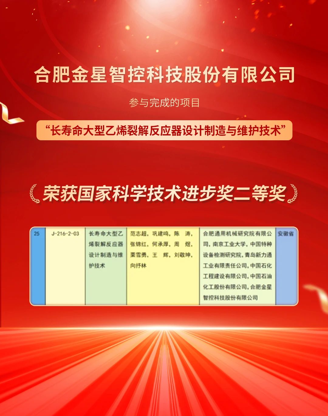 6月24日,2023年度國家科學技術(shù)獎在北京揭曉,由合肥通用機械研究院有限公司牽頭,合肥金星智控科技股份有限公司參與完成的項目“長壽命大型乙烯裂解反應器設(shè)計制造與維護技術(shù)”榮獲國家科學技術(shù)進步獎二等獎。這是金星智控第三次獲得國家科學技術(shù)進步獎二等獎,再度彰顯了民營企業(yè)的硬核科技實力。