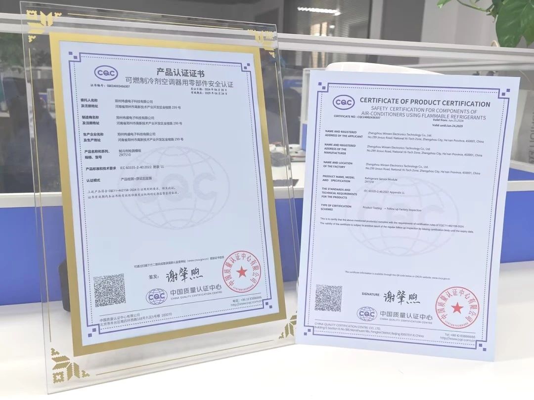 座談會上,CQC和UL Solutions的專家們深入探討了國際家電產(chǎn)品認(rèn)證的發(fā)展趨勢、標(biāo)準(zhǔn)要求以及市場準(zhǔn)入策略。并現(xiàn)場頒發(fā)了首批國際合作項目認(rèn)證證書,鄭州煒盛電子科技有限公司榮幸成為首批獲證企業(yè)之一,也是制冷劑傳感器領(lǐng)域首家獲證企業(yè),標(biāo)志著公司在可燃制冷劑空調(diào)器用零部件安全認(rèn)證領(lǐng)域邁出了堅實的步伐。