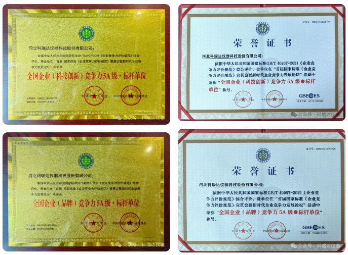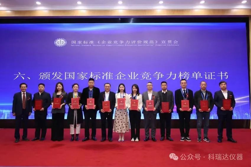 會議期間,科瑞達(dá)儀器憑借科技創(chuàng)新能力和品牌影響力,榮獲“全國企業(yè)(科技創(chuàng)新)競爭力5A級·標(biāo)桿單位”及“全國企業(yè)(品牌)競爭力5A級·標(biāo)桿單位”兩項榮譽稱號,曹總代表企業(yè)領(lǐng)取國家標(biāo)準(zhǔn)企業(yè)競爭力榜單證書。