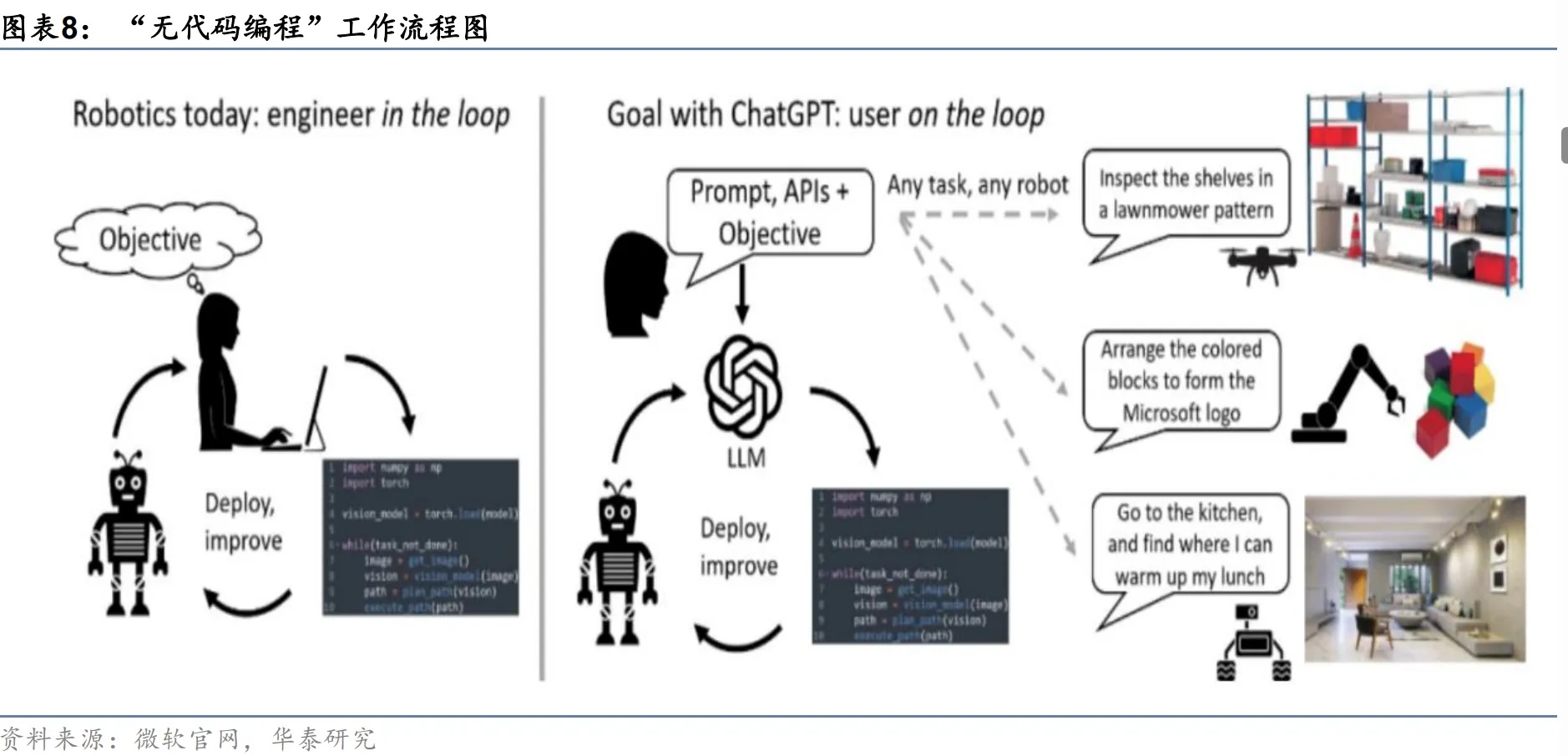 自目前生成式AI主要通過兩個層面對工業機器人進行輔助,第一,ChatGPT作為預訓練語言模型,可以被應用于人類與機器的自然語言交互。機器通過ChatGPT理解人類的自然語言指令,并根據指令進行相應的動作。第二,GPT可以幫助機器在執行路徑規劃、物體識別等任務時做出相應的決策。