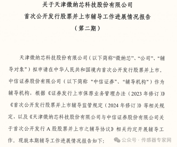 2024年1月19日,中信證券與微納芯簽署了輔導(dǎo)協(xié)議并于同日正式向中國證券監(jiān)督管理委員會天津監(jiān)管局(簡稱“天津證監(jiān)局”)報送輔導(dǎo)備案申請材料;2024年1月22日,天津證監(jiān)局同意微納芯輔導(dǎo)備案并出具輔導(dǎo)備案登記確認(rèn)書。2024年4月12日,中信證券向天津證監(jiān)局報送關(guān)于天津微納芯科技股份有限公司首次公開發(fā)行股票并上市輔導(dǎo)工作進(jìn)展情況報告(第一期)。2024年7月10日,中信證券向天津證監(jiān)局報送關(guān)于天津微納芯科技股份有限公司首次公開發(fā)行股票并上市輔導(dǎo)工作進(jìn)展情況報告(第二期)。截至目前,中信證券對微納芯的上市輔導(dǎo)工作仍在進(jìn)行中。