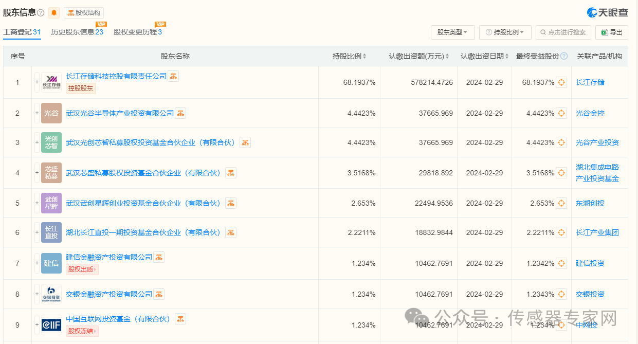2024年2月29日,武漢新芯引入30多家投資機(jī)構(gòu),包括廈門炬達(dá)二號投資合伙企業(yè)(有限合伙),武漢金融控股,武漢光谷半導(dǎo)體產(chǎn)業(yè)投資有限公司,武漢光創(chuàng)芯智私募股權(quán)投資基金,國鑫創(chuàng)投,招銀國際,長投集團(tuán),謝諾投資,中信證券,中國農(nóng)業(yè)銀行,中銀金融,湖北高投,恒盛融通投資,建信投資,中國工商銀行,東湖創(chuàng)投,交銀金融資產(chǎn)投資有限公司,海通創(chuàng)意資本,湖北長江直投等等。目前,武漢新芯的控股股東為長江存儲, 持股超68%。