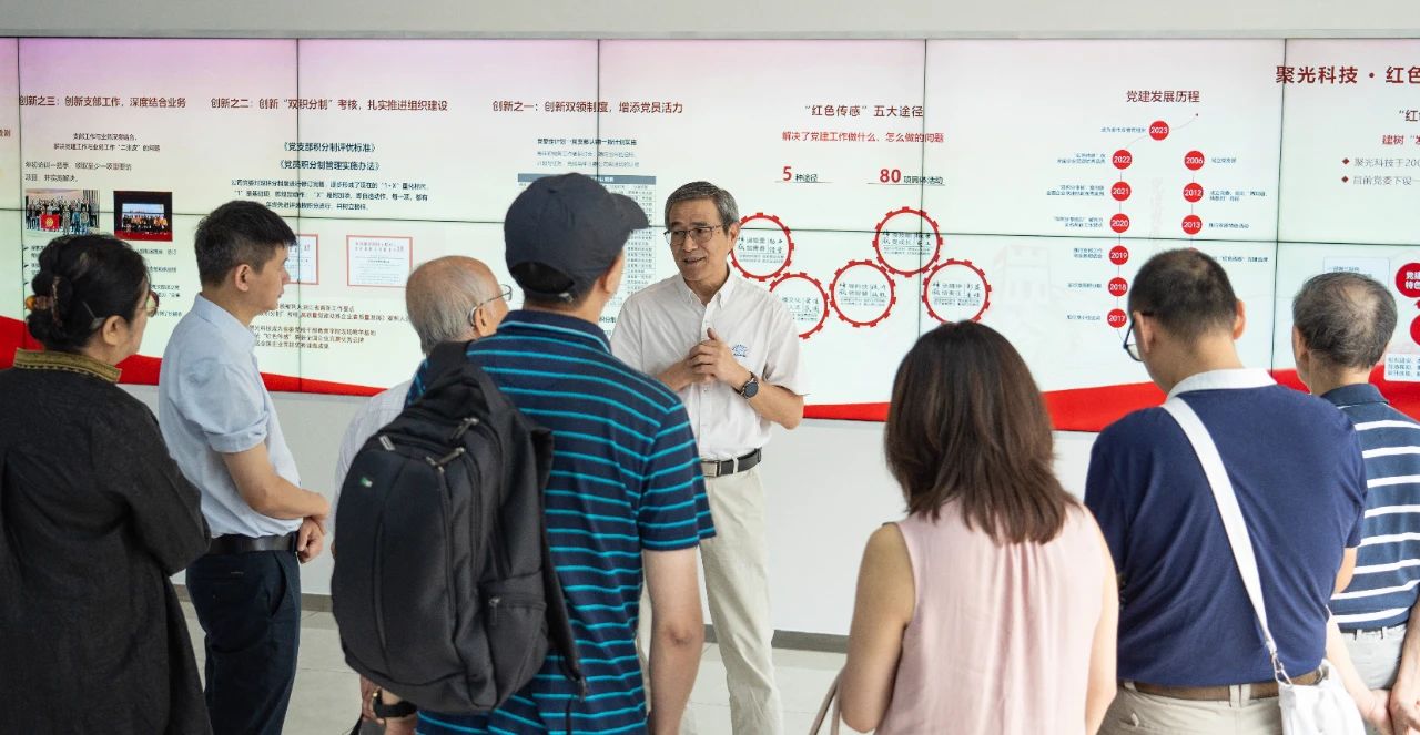 專家考察團一行參觀了聚光科技綠色科技展廳,陳熒平首先簡要介紹了聚光科技黨建的發展歷程、“紅色傳感”黨建品牌,以及雙領制、雙積分制、與業務深度結合的特色做法。
