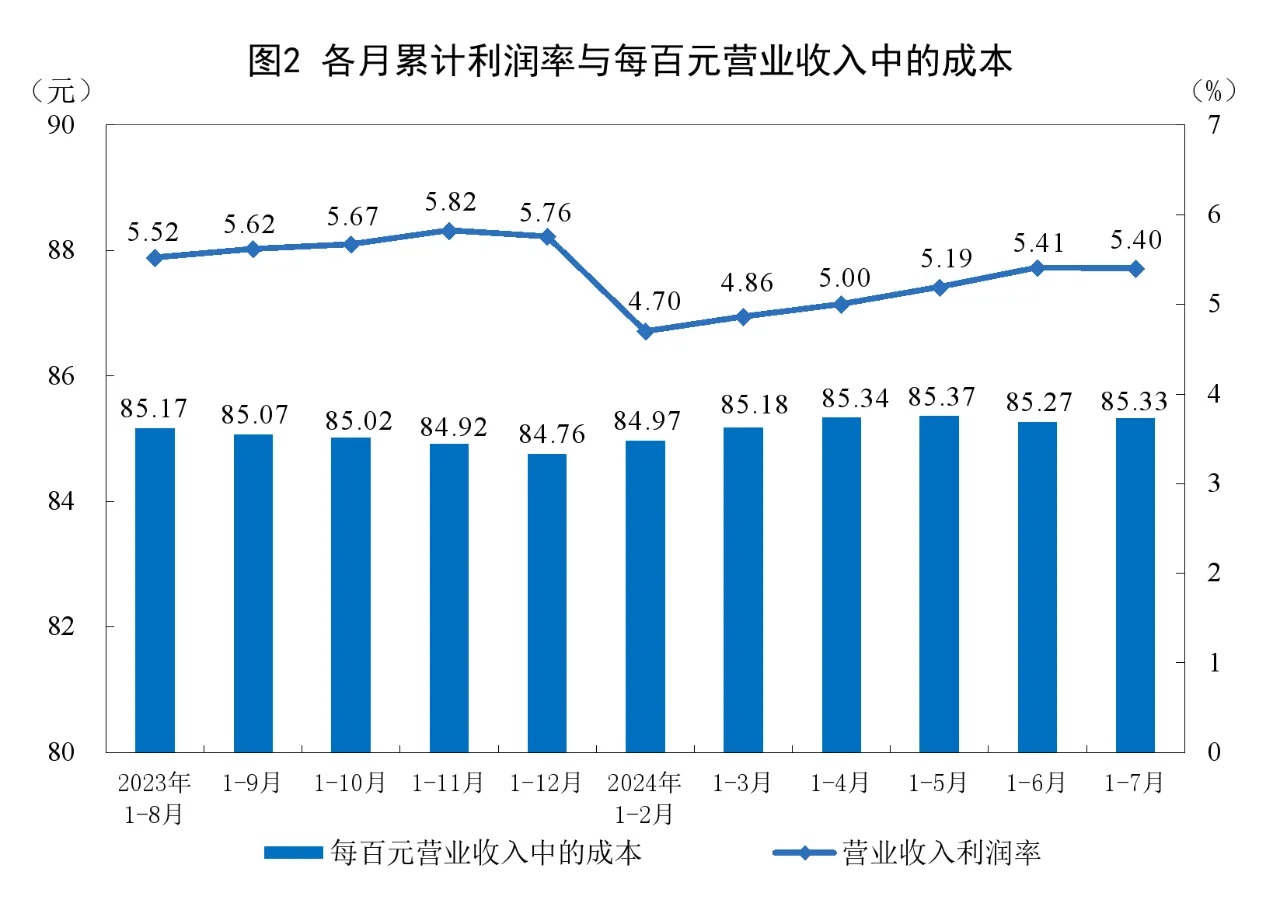 1—7月份,規(guī)模以上工業(yè)企業(yè)每百元營業(yè)收入中的成本為85.33元,同比增加0.09元;每百元營業(yè)收入中的費用為8.41元,同比持平。