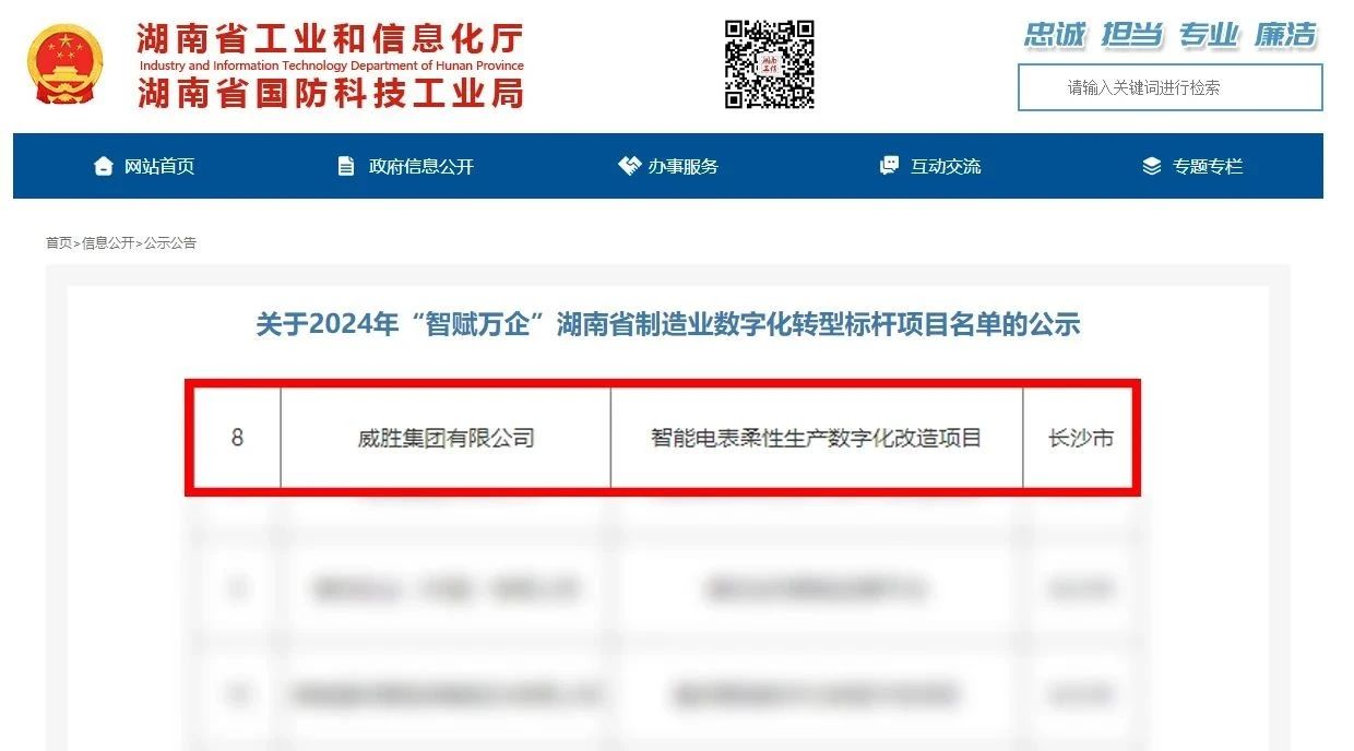 近日,湖南省工信廳公布2024年“智賦萬企”湖南省制造業(yè)數字化轉型標桿項目名單,共計遴選了162個湖南省制造業(yè)數字化轉型標桿項目,威勝集團有限公司的“智能電表柔性生產數字化改造項目”成功上榜。
