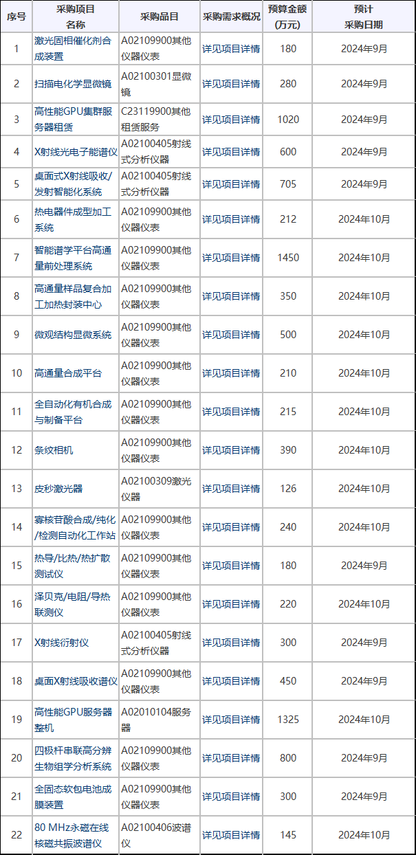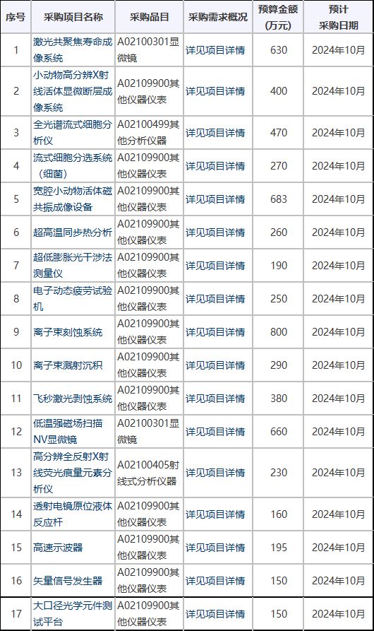 2024年9月2日,中國(guó)科學(xué)技術(shù)大學(xué)公布2024年9至12月政府采購(gòu)意向清單,涉及掃描電化學(xué)顯微鏡、X射線衍射儀、疲勞試驗(yàn)機(jī)、測(cè)量?jī)x、高速示波器等多種儀器設(shè)備,預(yù)算總額超過1.6億元。