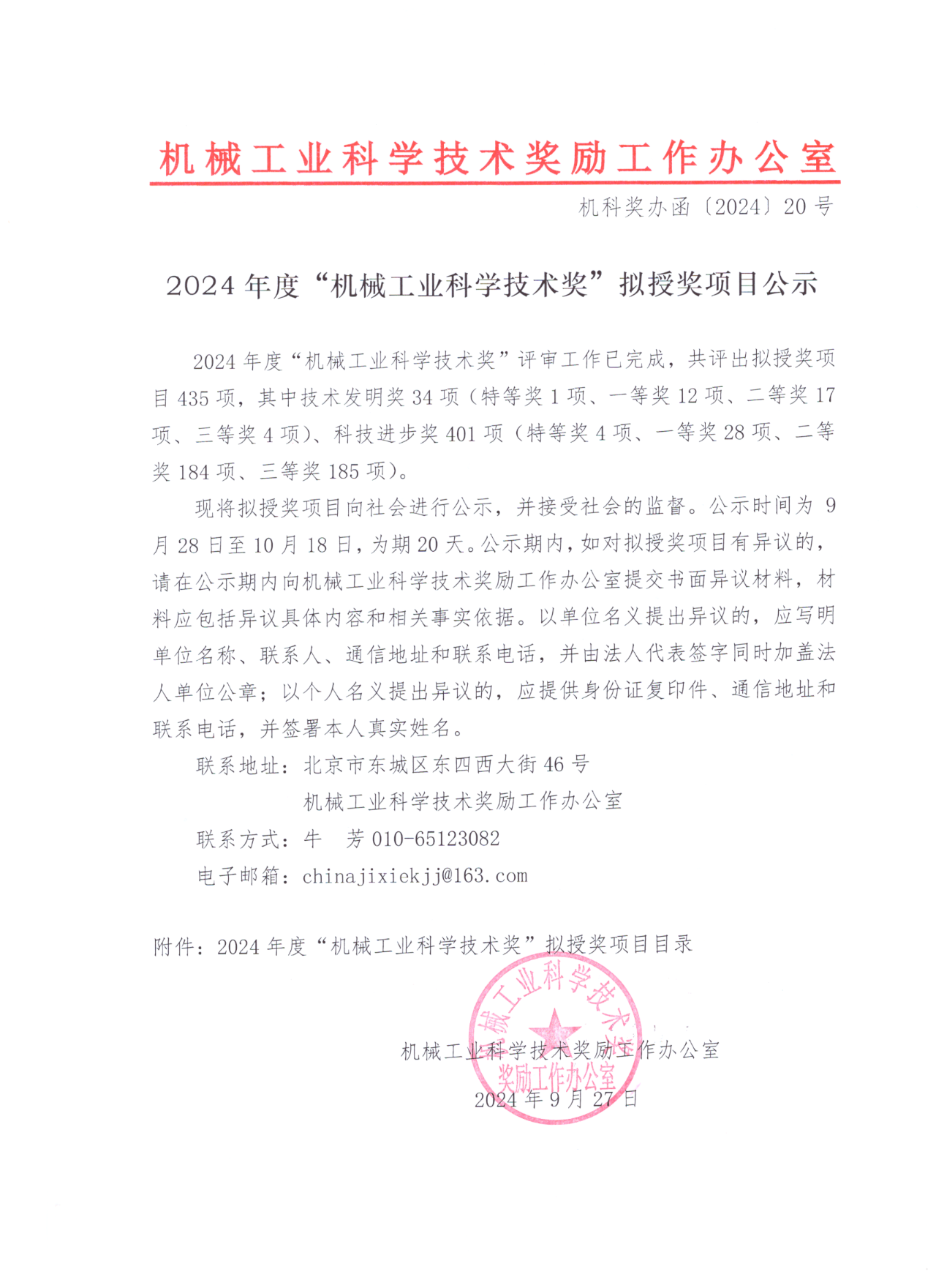 中國機械工業聯合會已將擬授獎項目向社會進行公示,并接受社會的監督。公示時間為928日至1018日,為期20天。公示期內,如對擬授獎項目有異議的,請在公示期內向機械工業科學技術獎勵工作辦公室提交書面異議材料,材料應包括異議具體內容和相關事實依據。以單位名義提出異議的,應寫明單位名稱、聯系人、通信地址和聯系電話,并由法人代表簽字同時加蓋法人單位公章;以個人名義提出異議的,應提供身份證復印件、通信地址和聯系電話,并簽署本人真實姓名。