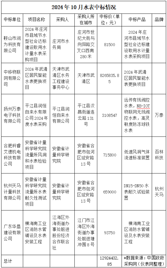 202410月,全國各地水表采購項目中標情況揭曉,多家企業在激烈的市場競爭中脫穎而出,成功中標各自領域的項目。根據中國政府采購網公布的數據,10月水表采購總金額高達12924432.85元,涵蓋了節水型社會建設、智能水表更換、水表采購及檢驗等多個方面。