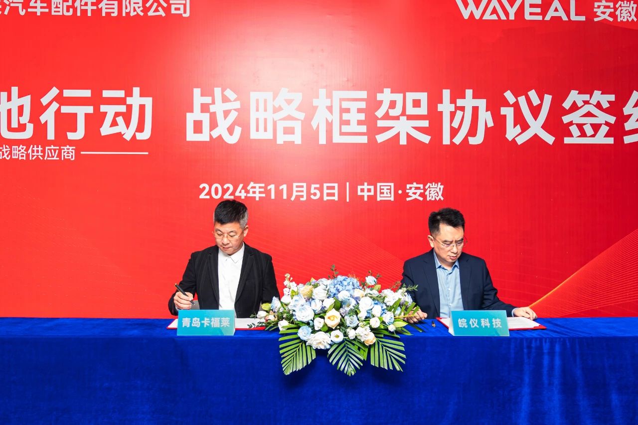 11月5日上午,安徽皖儀科技股份有限公司(以下簡稱“皖儀科技”)與青島卡福萊汽車配件有限公司(以下簡稱“青島卡福萊”)在皖儀科技總部正式簽署基地行動戰略框架協議。雙方圍繞汽車配件行業所面臨的新領域、新機遇展開深入交流,共同探索汽車配件行業發展新篇章。