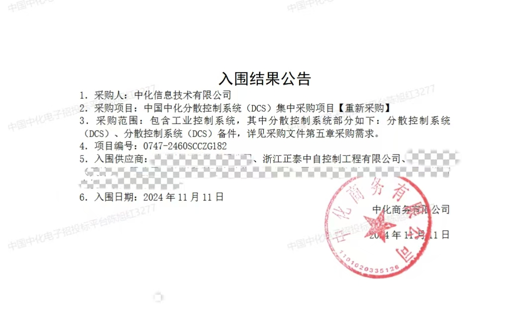 近日,中國中化分散控制系統(tǒng)(DCS)集中采購項目入圍結(jié)果公告發(fā)布,正泰中自提供的自產(chǎn)軟硬件和服務(wù)、安全柵、第三方產(chǎn)品成功入圍,被中化確定為入圍供應(yīng)商。