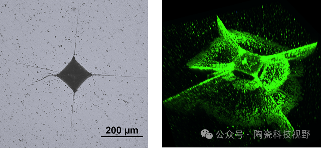 將方形金字塔形金剛石壓頭(維氏壓頭)壓入陶瓷表面,人為地引入壓痕和裂紋。使用普通金相顯微鏡觀察反射圖像時,只能在暴露于表面的區(qū)域觀察到裂紋,如下圖左所示,為此,研究團(tuán)隊(duì)開發(fā)了一種在室溫和大氣壓下使用激光熒光顯微鏡從表面沿深度方向觀察熒光圖像的技術(shù)。