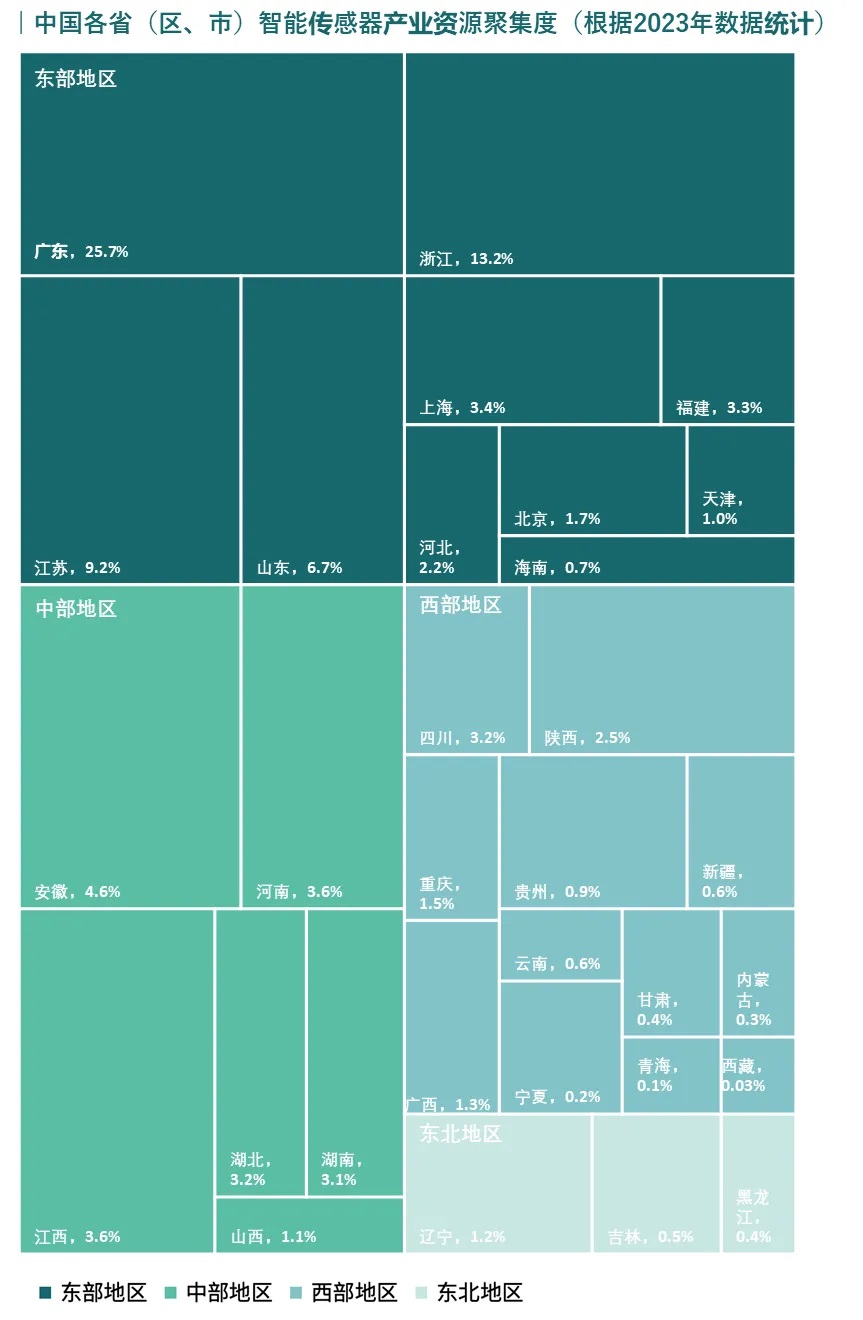 中國智能傳感器區(qū)域發(fā)展整體呈現(xiàn)東部持續(xù)領(lǐng)先、中西部崛起有望的態(tài)勢。目前,東部地區(qū)聚集了全國67.1%的產(chǎn)業(yè)資源,廣東、浙江、江蘇、山東、上海等省(市)的企業(yè)資源領(lǐng)跑全國。近年來,中部的安徽、河南、湖北等地以及西部的四川、陜西、重慶等地,也在持續(xù)加大對智能傳感器產(chǎn)業(yè)的支持力度。“十五五”時期,中國的智能傳感器產(chǎn)業(yè)資源將仍以東部為引領(lǐng),但中西部的部分省份也將逐步崛起,實現(xiàn)區(qū)域多點開花的發(fā)展格局。