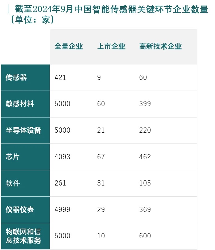 截至2024年9月,中國智能傳感器全產(chǎn)業(yè)鏈企業(yè)數(shù)量達到2.0萬家,其中,上市企業(yè)227家、高新技術(shù)企業(yè)2215家。“十五五”時期,隨著物聯(lián)網(wǎng)、人工智能、智能制造等領(lǐng)域的快速發(fā)展,中國智能傳感器在智能家居、可穿戴設(shè)備、智能移動終端等新興領(lǐng)域的應(yīng)用將不斷增加。