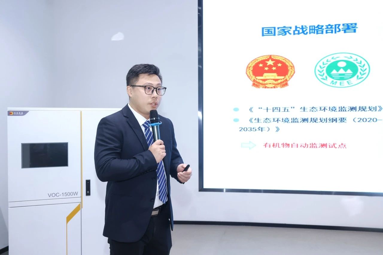 隨后,產品研發(fā)部經(jīng)理譚國斌博士為大家詳細介紹了本次發(fā)布的2位家族成員。《“十四五”生態(tài)環(huán)境監(jiān)測規(guī)劃》、《生態(tài)環(huán)境監(jiān)測規(guī)劃綱要(2020-2035年)》等政策法規(guī)中都指出,國家將建設有機物自動監(jiān)測試點;水質異味投訴頻發(fā)、GB5749-2022新增2項異味指標、GB/T 5750-2023引入新檢測方法;在這樣需求背景下,傳統(tǒng)分析檢測方法存在手工檢測時間滯后、數(shù)據(jù)量少等痛點。另外,我國食品和農產品農殘超標現(xiàn)狀不容樂觀,傳統(tǒng)快檢技術存在檢測項少、目標物單一、準確率低等局限性。農殘快速篩查面臨挑戰(zhàn)、急需高效篩查新技術。針對以上現(xiàn)狀與需求,禾信儀器集中力量研發(fā)推出了VOC-1500W水中異味和揮發(fā)性有機物在線自動監(jiān)測系統(tǒng)和TAPI-TOF 1000M1快速篩查質譜移動檢測車兩款國內首創(chuàng)的新產品。在未來將助力水質檢測、食品安全、毒品檢測等更多領域。