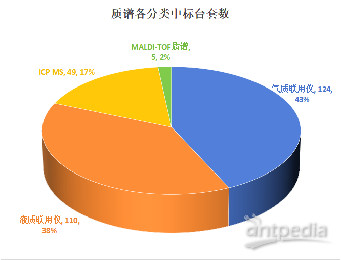 從質譜儀器的分類角度分析,本文涵蓋了氣質聯用儀、液質聯用儀、ICP MS以及MALDI-TOF質譜四大類別。在中標情況方面,氣質聯用儀和液質聯用儀占據了主導地位。具體來看,氣質聯用儀共中標124臺,占比達到43%;液質聯用儀緊隨其后,中標110臺,占比38%;ICP MS中標49臺,MALDI-TOF質譜中標5臺。