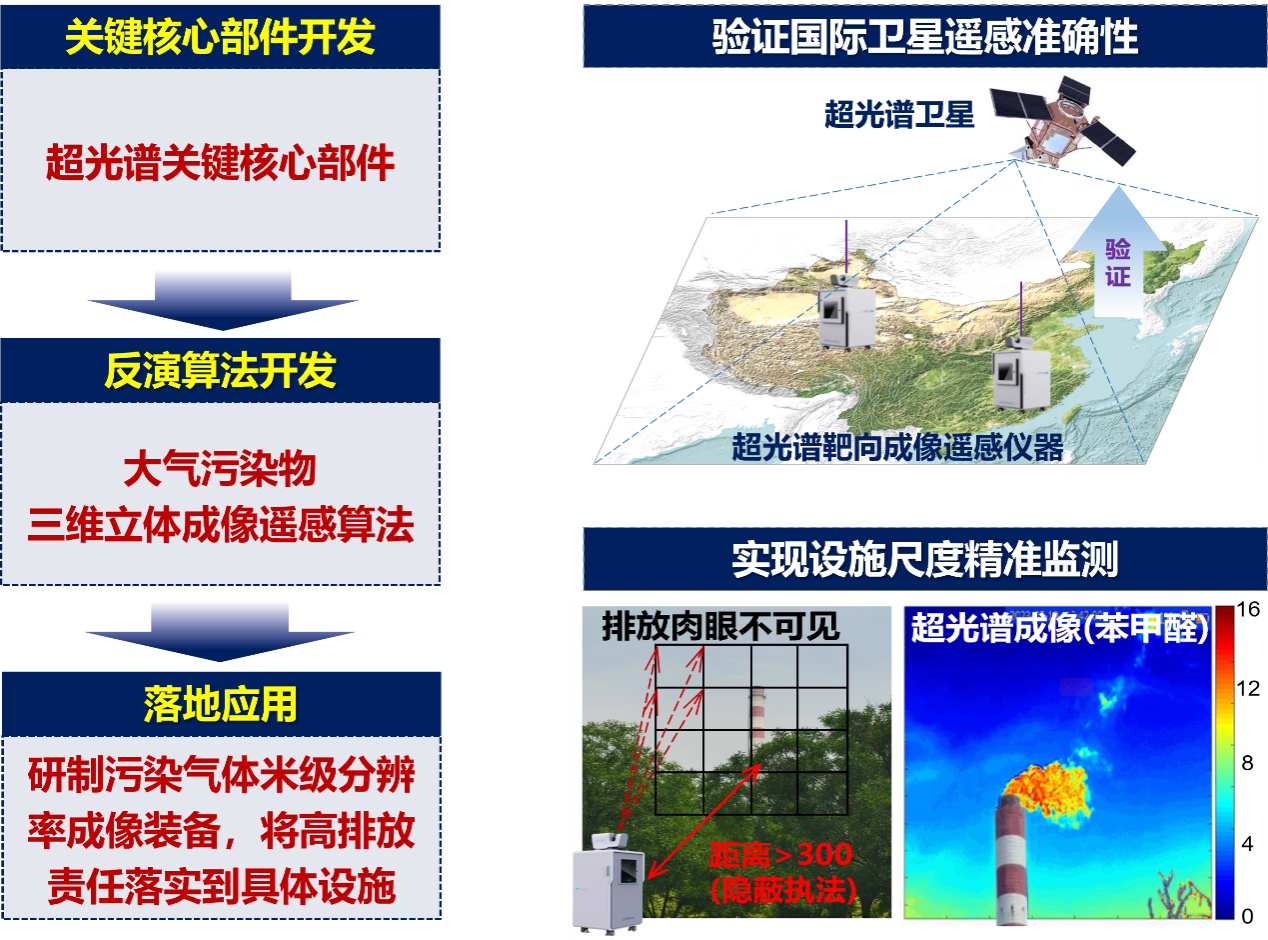 團隊通過一系列關鍵部件和技術突破,使超光譜靶向成像裝備同時實現了污染源靶向成像、多組分氣體水平與垂直成像功能,推動了我國自主可控的大氣環境超光譜立體遙感技術創新,為我國“降碳減污”工作提供了必不可少的新技術和新裝備支撐。