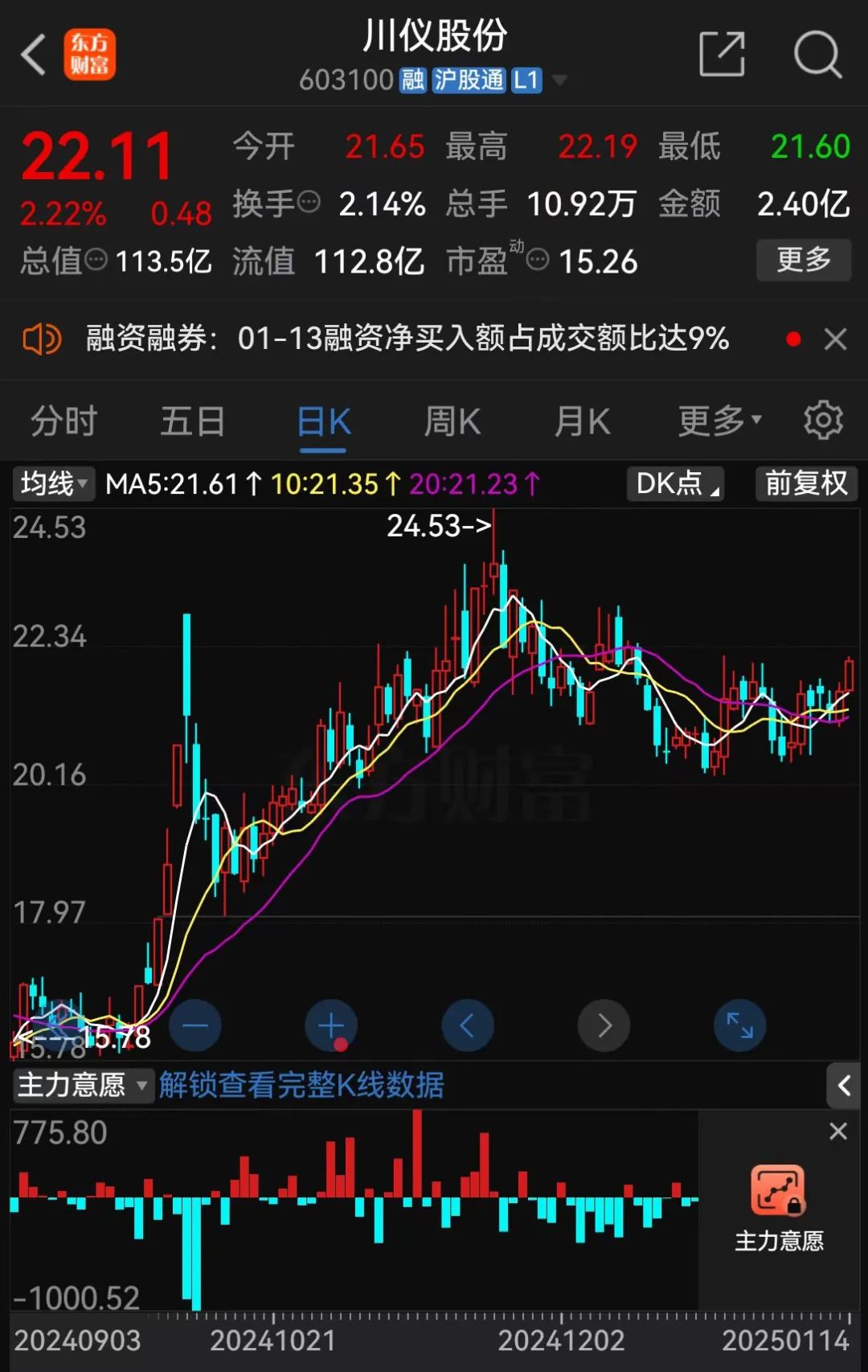 1月14日收盤,川儀股份股價報22.11元/股,漲幅為2.22%,總市值為113.5億元。