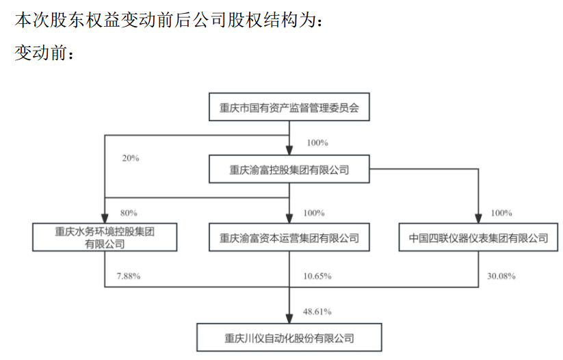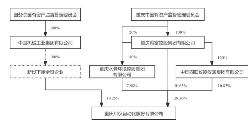 上述交易完成前,重慶市國資委合計掌控川儀股份48.61%的股份比例。上述交易完成后,重慶市國資委合計掌控川儀股份29.36%的股份比例,國機集團或其新設(shè)全資企業(yè)將持有川儀股份19.25%的股份比例。
