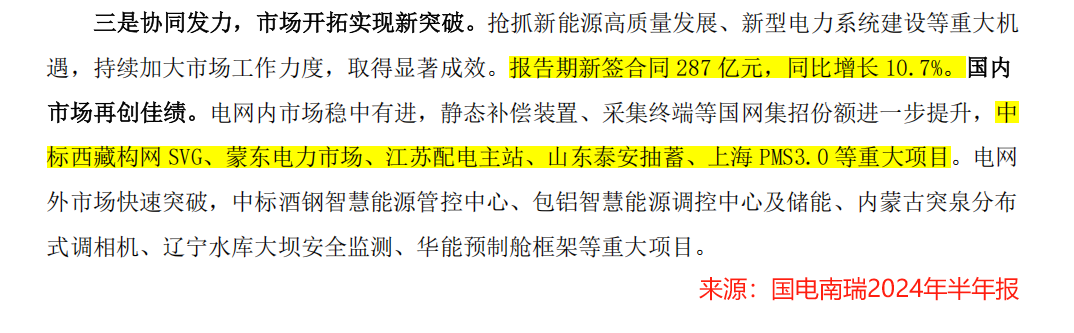 2024年上半年,國(guó)電南瑞新簽合同287億,同比增長(zhǎng)10.7%,并且中標(biāo)了蒙東電力市場(chǎng)、江蘇配電主站、山東泰安抽蓄等重大項(xiàng)目。