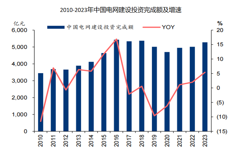 2023年電網(wǎng)基本建設(shè)投資額為5275億,同比增長(zhǎng)5.4%,預(yù)計(jì)2024—2025年電網(wǎng)投資將維持在7%的高增速,2025年電網(wǎng)基本建設(shè)投資額可能超過(guò)6000億。